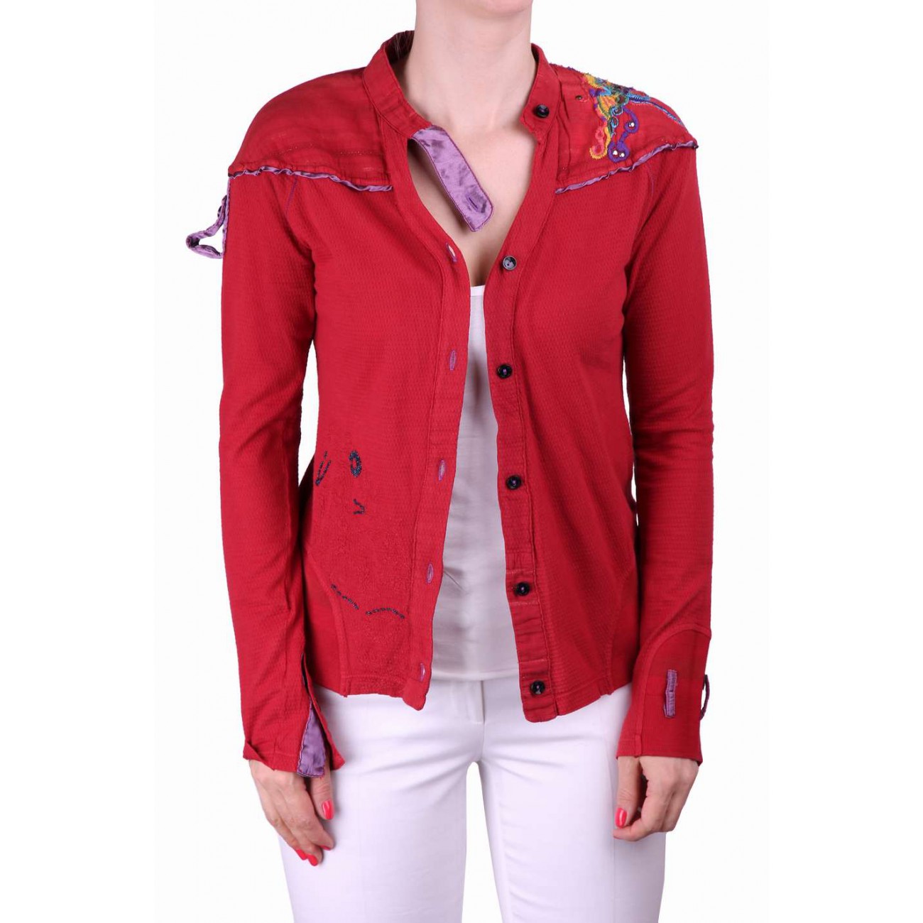 Фактурное котоновое полотно рубашки эффектно заканчивается широкой трикотажной резинкой на манжетах и поясе. Высокий манжет спрятан  во внутрению часть рукава и застегивается на две пуговицы.  Вырез "мыс" дополняется атласным хлястиком. Яркая вышивка на рубашке делает ее неповторимой и оригинальной. Рубашку можно одевать как самостоятельную вещь или жакет.
